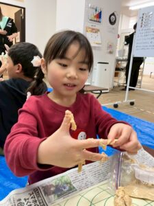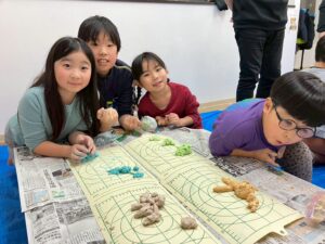 今回は粘土づくりの後に造形を行いました。テーブルのお友達と協力しながら