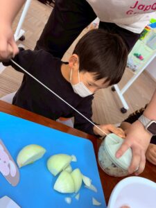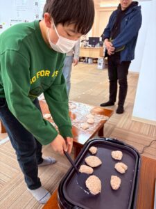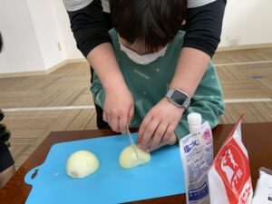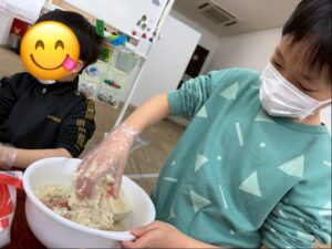 包丁を使って玉ねぎを切ったり、豆腐とひき肉を混ぜたりと、工程ごとに役割分担をしながら取り組みました♪